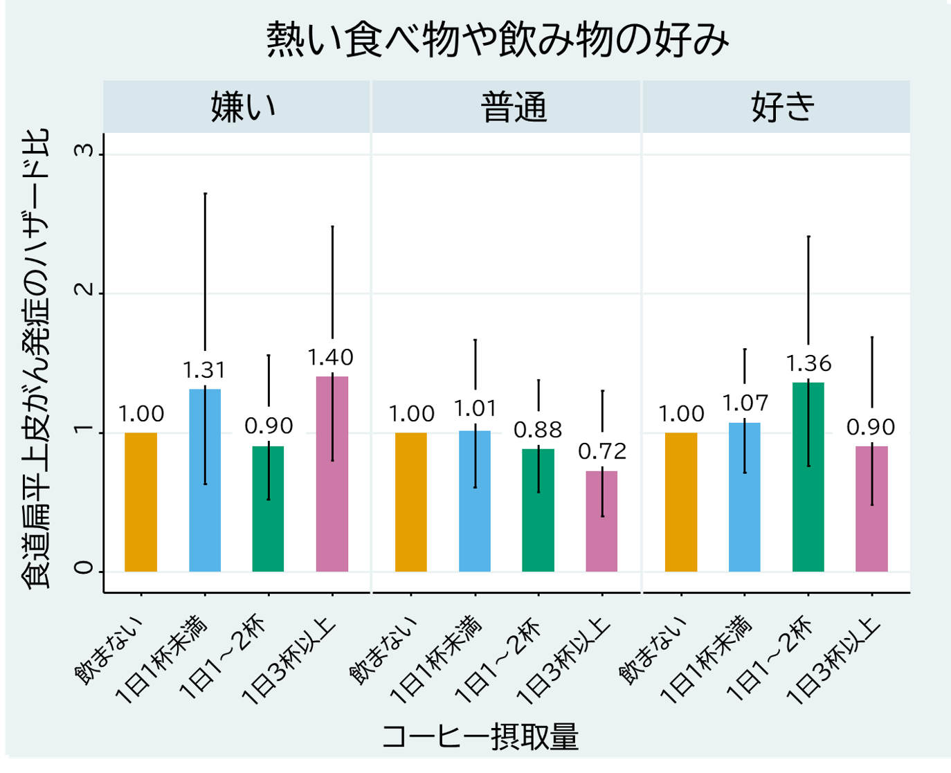 熱い飲食物を好む人および好まない人のどちらにおいても、コーヒー摂取は食道扁平上皮がんの罹患リスクと明確な関連を認めず
