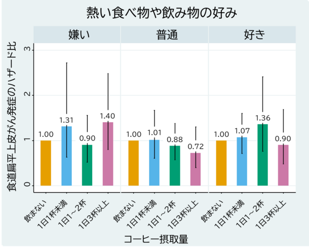 平均18.7年間の追跡期間において、434人(男性398人、女性36人)が食道扁平上皮がんに罹患しました。解析の結果、コーヒー摂取と食道扁平上皮がんリスクとの間の明確な関連は見られませんでした (図1)。男性のみに限定した結果も結果は変わらず、女性は食道がんの罹患数が少なく評価ができませんでした。また、熱い飲食物の好み(嫌い/普通/好き)と食道がんとの関連について、男性に限定して分析を行ったところ、いずれの好みにおいてもコーヒー摂取と食道扁平上皮がんの罹患リスクに明確な関連は見られませんでした (図2)。