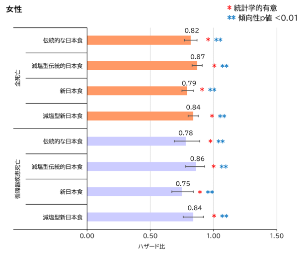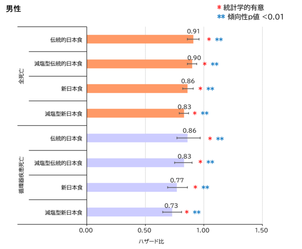 全ての日本食パターンで全死亡と循環器疾患死亡リスク低下がみられ、特に男性では、減塩型新日本食パターンでリスクが低下した