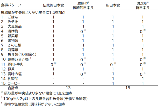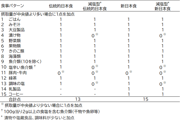 日本人の平均寿命は世界最高レベルですが、その要因の一つとして食事が考えられています。これまでに、私たちの研究では、8つの食品(ごはん、みそ汁、海藻類、漬物、緑黄色野菜、魚介類、緑茶、牛肉・豚肉)の摂取量で点数化された「日本食パターン」のスコアが高いと死亡リスクが低いこと(日本食パターンと死亡リスクとの関連について)を報告していますが、従来からの日本食の特徴である大豆製品、きのこ類や果物類が含まれていませんでした。また、近年、日本では乳製品やコーヒーの摂取量が増加しており、コーヒーや乳製品は死亡リスクや循環器疾患リスクを下げることが報告されています。加えて、我が国の食塩摂取量は減少してきていますが、欧米と比べるとまだ高いことが課題です。そこで、上記の「日本食パターン」に大豆製品、きのこ類、果物類を加えた「伝統的日本食パターン」、更にコーヒーと乳製品を追加した「新日本食パターン」、そして、漬物や塩蔵食品、調味料が少ないと加点する「減塩型伝統的日本食パターン」と「減塩型新日本食パターン」の、4つの日本食パターンを構築し、死亡リスクとの関連を調べました(表1)。