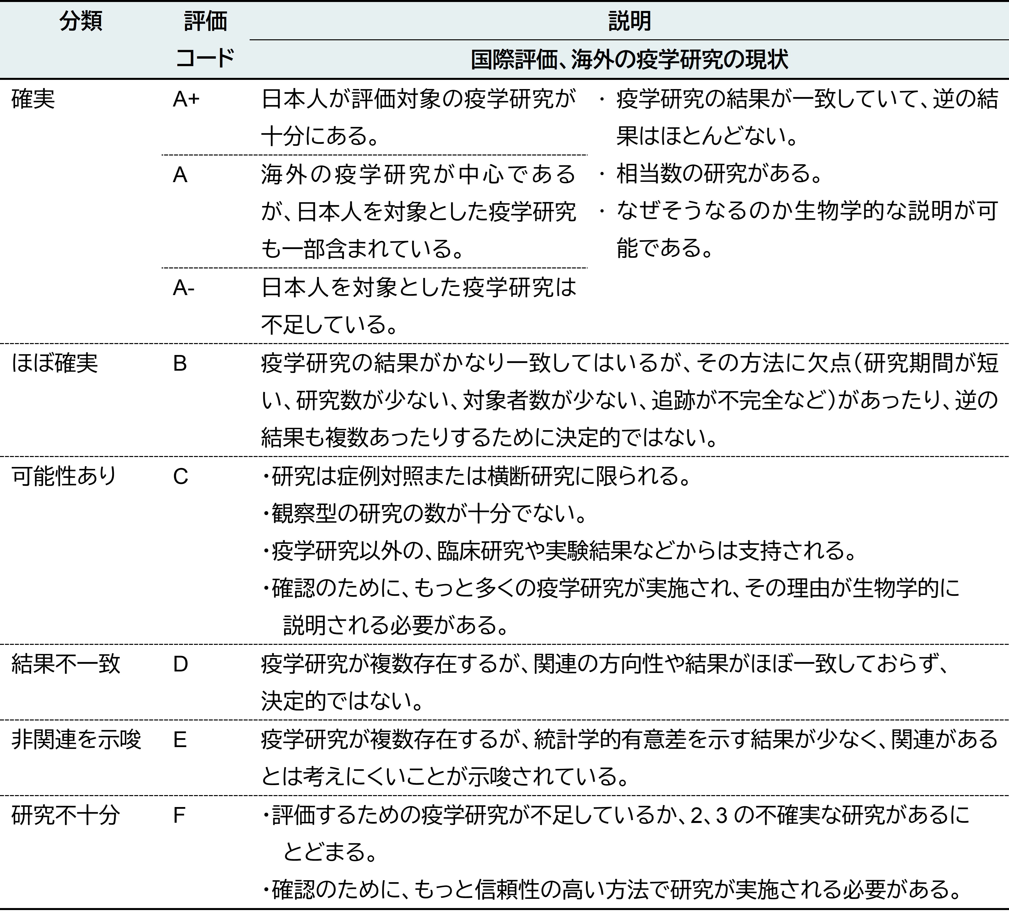 収集した文献を総合的に勘案し、要因と疾患アウトカムとの関連にする科学的根拠としての信頼性の強さを以下の基準に基づき「確実」、「ほぼ確実」、「可能性あり」、「結果不一致」、「非関連を示唆」、「研究不十分」のいずれかに分類します。これらの分類においては、特に、研究間の結果の一致度や生物学的機序を重視しています。さらに、「確実」の評価区分は、国際評価や海外の疫学研究の現状に加え、日本人を対象とした疫学研究の状況によりさらに三段階に分類しています。